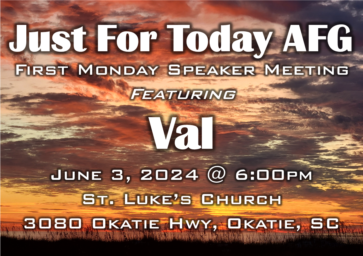 Just For Today AFG will be hosting their first Monday of the month speaker meeting. Join them at 3080 Okatie Hwy. in Okatie, SC at 6:00pm June 3rd!